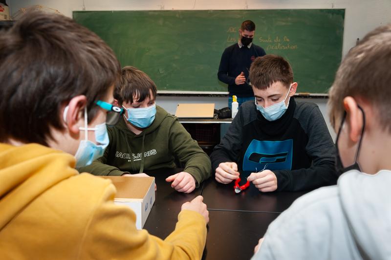 "Ik begin altijd met een eerste activiteit die me in staat stelt de persoonlijkheid, verlangens en interesses van mijn leerlingen te identificeren. Vervolgens leren zij de plattegrond van een huis te lezen, een activiteit die reflectie vereist. Het grote project van dit jaar is de bouw van een brug, waarbij ze rekening moeten houden met enkele voorwaarden: breedte van de brug, lengte van het te overbruggen ravijn, het te dragen gewicht, een beperkt aantal beschikbare middelen, ... Voor deze activiteit was er een theorieles, een individuele reflectie met bestudering van het dossier en het maken van schetsen, daarna de bouw van de brug in groepjes van 4.”